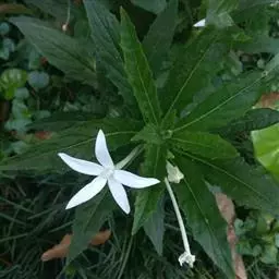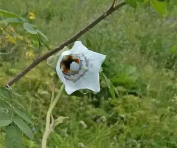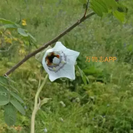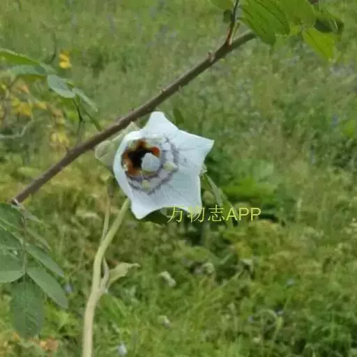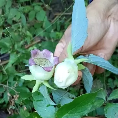 花单生于茎及分枝的顶端;花梗长,灰绿色,疏生短小的白色硬毛;花萼贴生至子房中部,筒部半球状,具10条明显辐射脉,绿色,有白粉,无毛或微被白色硬毛;裂片间湾缺尖狭,紧接,裂片卵形、椭圆形或卵状披针形,顶端急尖,全缘,长约1.5-2厘米,宽约6-8毫米,蓝灰色,无毛或顶端微具短柔毛;花冠阔钟状,长约2.8厘米,直径约2.6厘米,淡蓝色而具深蓝色花脉,内部常有紫斑,无毛;雄蕊无毛,花丝基部微扩大,花药矩圆状,各长约5-6毫米。在蒴果上宿存的花萼裂片极度长大,并向外反卷。