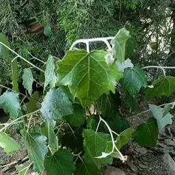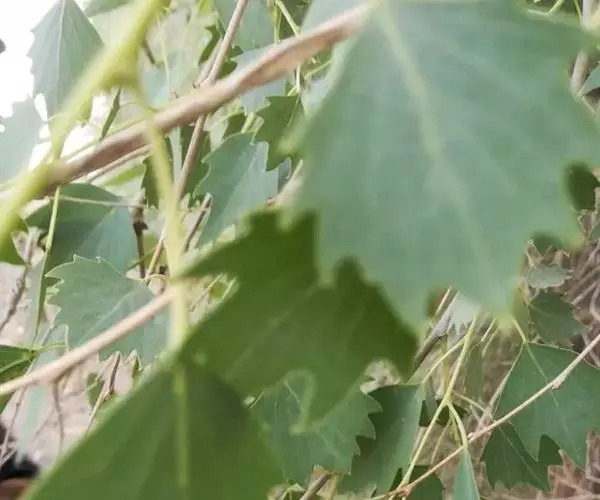 叶形多变化,卵圆形、卵圆状披针形、三角伏卵圆形或肾形,长25厘米,宽3厘米,先端有2~4对粗齿牙,基部楔形、阔楔形、圆形或截形,有2腺点,两面同色;稀近心形或宽楔形;叶柄长1~3厘米光滑,微扁,约与叶片等长,萌枝叶柄极短,长仅1厘米,有短绒毛或光滑。叶子边缘还有很多缺口,又有点像枫叶,叶革质化、枝上长毛,甚至幼树叶如柳叶,以减少水分的蒸发,故它又有“变叶杨”、 “异叶杨”之称。