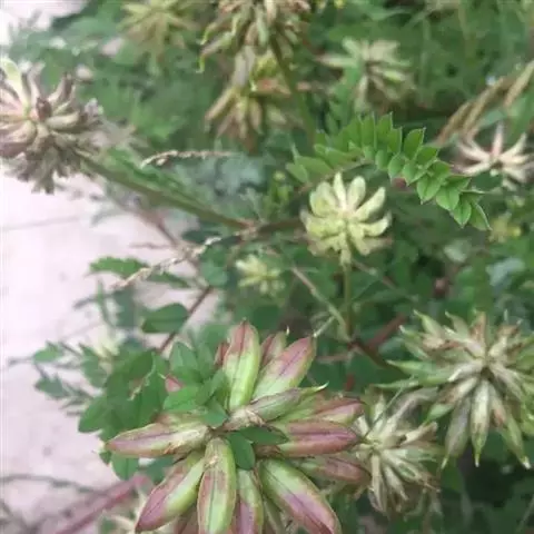 奇数羽状复叶,具7-13片小叶,长5-15厘米;叶柄较叶轴短;托叶离生,卵形,长3-6毫米,先端尖,基部互相多少合生,具缘毛;小叶倒卵形或椭圆形,长10-15毫米,宽4-10毫米,先端钝圆或微凹,基部宽楔形,上面近无毛,下面散生白色柔毛,具短柄。