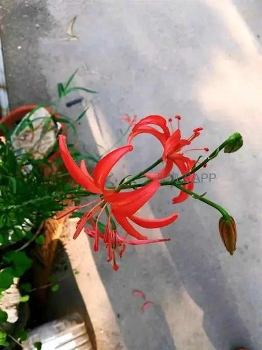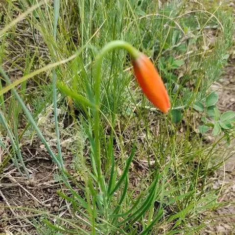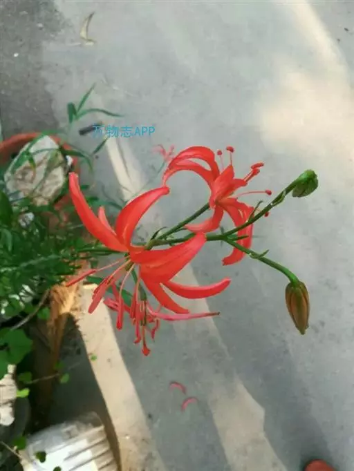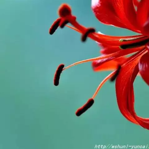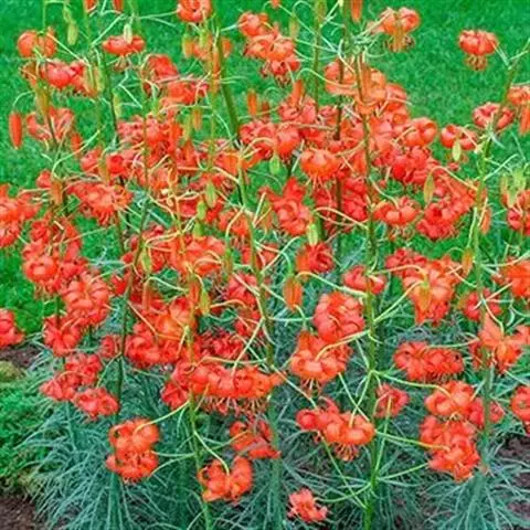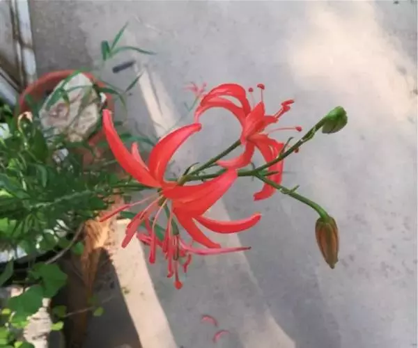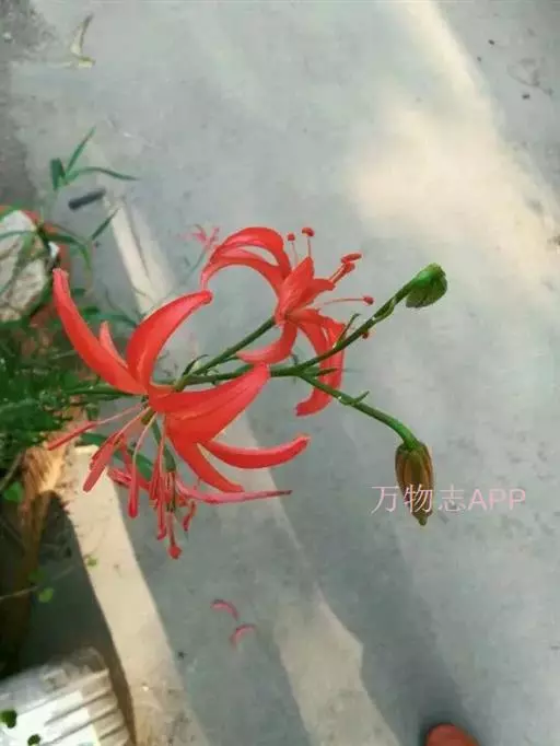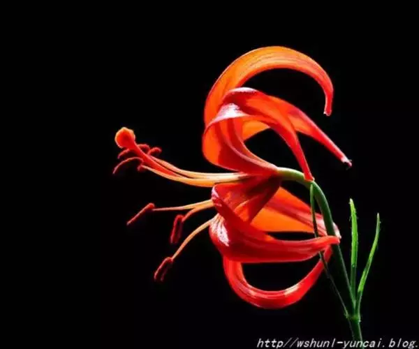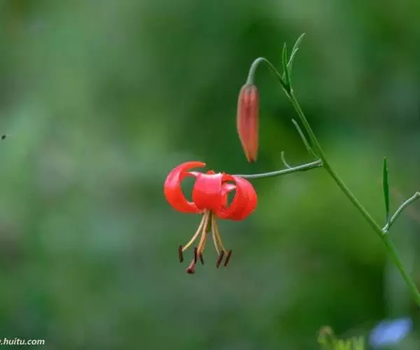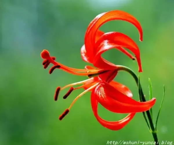 山丹百合 鳞茎卵形或圆锥形,高2.5-4.5厘米,直径2-3厘米;鳞片矩圆形或长卵形,长2-3.5厘米, 宽1-1.5厘米,白色。茎高15-60厘米,有小乳头状突起,有的带紫色条纹。叶散生于茎中部,条形,长3.5-9厘米,宽1.5-3毫米,中脉下面突出,边缘有乳头状突起。花单生或数朵排成总状花序,鲜红色,通常无斑点,有时有少数. 斑点,下垂;花被片反卷,长4-4.5厘米,宽0.8-1.1厘米,蜜腺两边有乳头状突起;花丝长1.2-2.5厘米,无毛,花药长椭圆形,长约1厘米,黄色,花粉近红色;子房圆柱形,长0.8-1厘米;花柱稍长于子房或长1倍多,长1.2-1.6厘米,柱头膨大,径5毫米,3裂。蒴果矩圆形,长2厘米,宽1.2-1.8厘米。花期7-8月,果期9-10月。