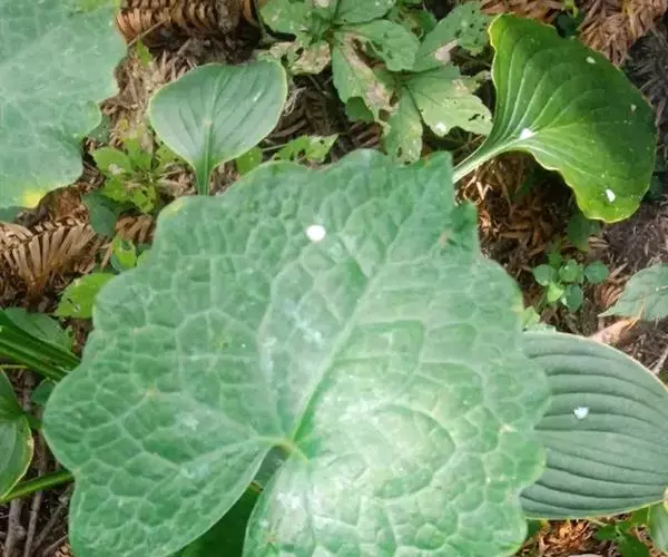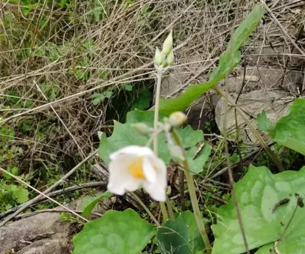 多年生无毛草本,具红黄色液汁。根橙黄色,根茎匍匐。叶全部基生,叶片心形或心状肾形,稀心状箭形,长5-26厘米,宽5-20厘米,先端渐尖或急尖,基部耳垂,边缘呈波状,表面绿色,背面灰绿色,掌状脉5-7条,网脉细,明显;叶柄条形或狭条形,长10-30厘米,带蓝灰色,基部略扩大成狭鞘。花葶灰绿色略带紫红色,高20-40厘米,有3-5花,排列成聚伞状伞房花序;苞片和小苞片卵状披针形,长2-10毫米,先端渐尖,边缘薄膜质;花梗直立,长0.5-5厘米。花芽卵珠形,长约1厘米,先端渐尖;萼片长0.5-1厘米,无毛;花瓣倒卵形,长1-2.5厘米,宽0.7-1.8厘米,白色;花丝长5-7毫米,花药黄色, 长约3毫米;子房卵形或狭卵形,长0.5-1厘米,无毛,花柱长3-5毫米,柱头2裂,下延于花柱上。蒴果狭椭圆形,长约2厘米,宽约0.5厘米,花柱延长达1厘米(果未成熟)。花期3-6月,果期6-10月。