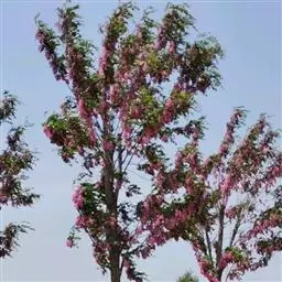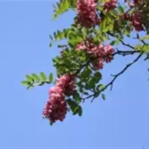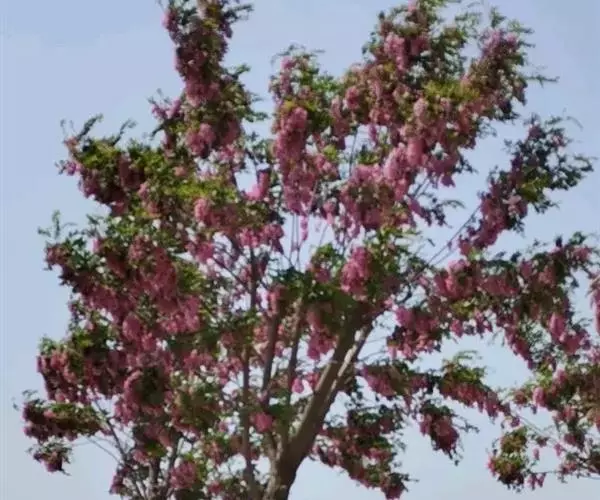 红花洋槐树体高大,叶色鲜绿,春季开花时节玫粉色花挂满枝头,芳香四溢。花为蜜源,木材质硬,耐腐。适宜庭园、道路绿化种植;也是工矿区绿化及荒山荒地造林的理想树种之一。