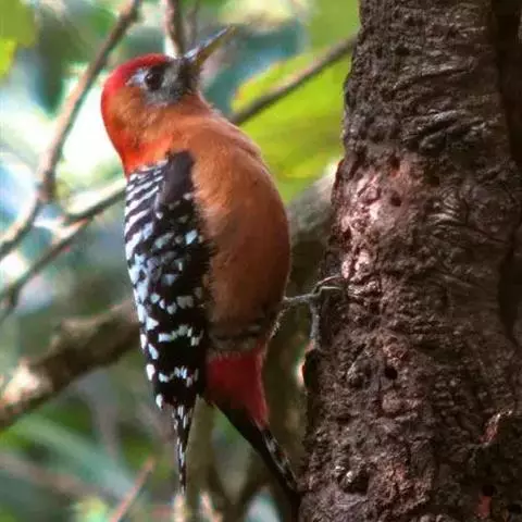 红腹啄木鸟成年雄鸟头项有红帽,翅膀和上体是黑白相间的斑纹状羽毛,腹部有一片红羽毛。头亦大,但颈较长,…