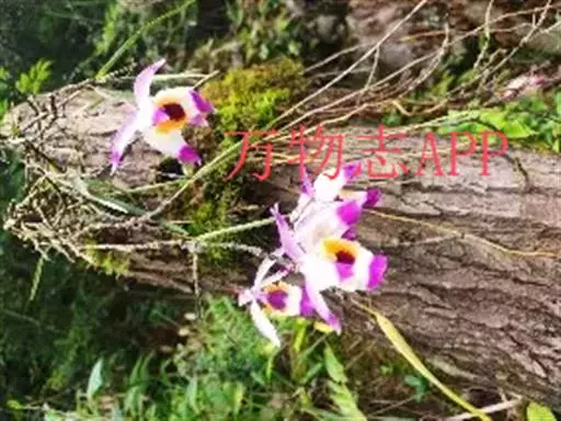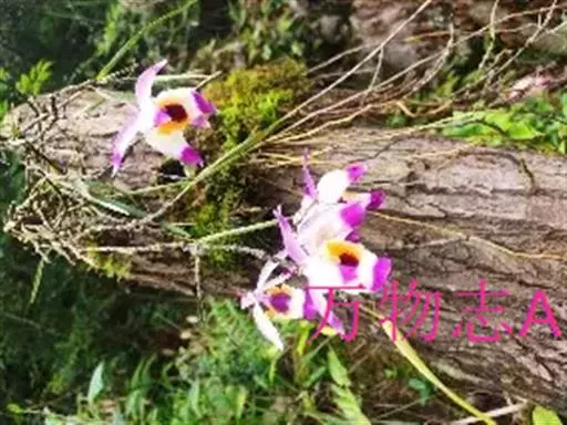 串珠石斛(学名:Dendrobium falconeri Hook.):茎悬垂,肉质,细圆柱形,近中部或中部以上的节间常膨大,多分枝,在分枝的节上通常肿大而成念珠状。叶薄革质,常2-5枚,互生于分枝的上部,狭披针形。总状花序侧生,常减退成单朵;花大,开展,质地薄,很美丽;萼片淡紫色或水红色带深紫色先端;花瓣白色带紫色先端,卵状菱形,长2.9-3.3厘米,宽1.4-1.6厘米,先端近锐尖,基部楔形,具5-6条主脉和许多支脉;唇瓣白色带紫色先端,卵状菱形。花期5-6月。
