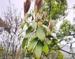高大乔木,高达28米;树皮灰褐色。枝粗壮,暗褐色,无毛。顶芽近球形,外部的鳞片宽卵形,长2毫米,有小凸尖,除边缘外具早落的微小绢毛,内面的鳞片较长,有黄褐色绢毛。叶互生或在当年生枝上轮生,倒卵状长圆形,长14-24(32)厘米,宽3.5-7(8)厘米,先端短渐尖,基部楔形,坚纸质,幼时下面全面被贴伏银色绢毛,老时上面深绿,无毛,下面带灰白色,仍有稍疏绢毛,且脉上较密,后渐脱落,中脉在上面凹下,在下面显著凸起,侧脉每边14-20(24)条,略带红色,侧脉间有疏离的横脉,小脉稍疏,连结成网状,不太明显;叶柄稍粗,长1-3厘米,无毛。