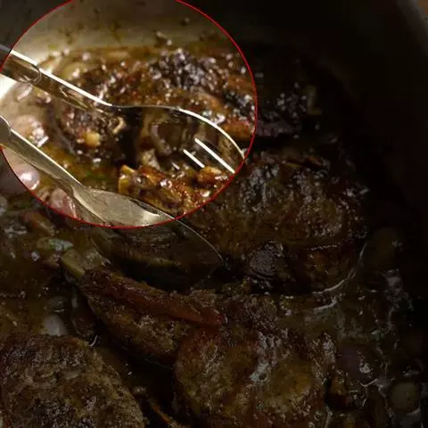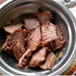 6. 煮好的肉片倒进铺有圆白菜的大碗中。