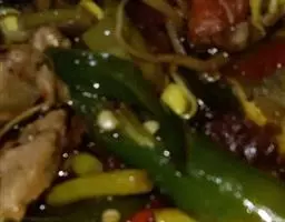 3. 用剩余的植物油烧开,淋在肉片上,使热油把干辣椒、花椒粉、肉片再炸一下,即可使麻、辣、浓香四溢。