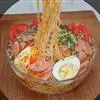 7.肉片入沸水汤汁中用筷子划散,再次煮沸后肉片连汤一起倒入垫有蔬菜的碗中。