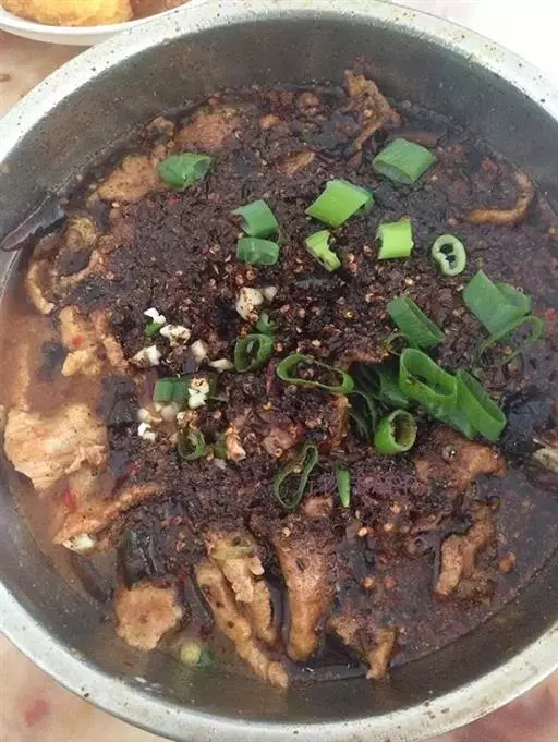 6. 随即放入肉片,再炖,肉片熟后,将肉片盛起,将剁碎的干辣椒、花椒末撒上;