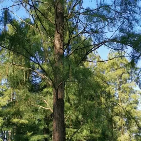 落羽杉 Rich.),杉科落羽杉属木本植物。树干尖削度大,基部通常膨大,具膝状呼吸根,树皮棕色,…