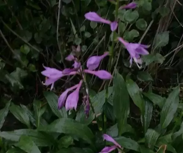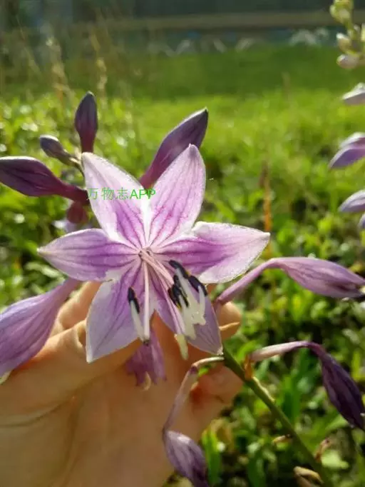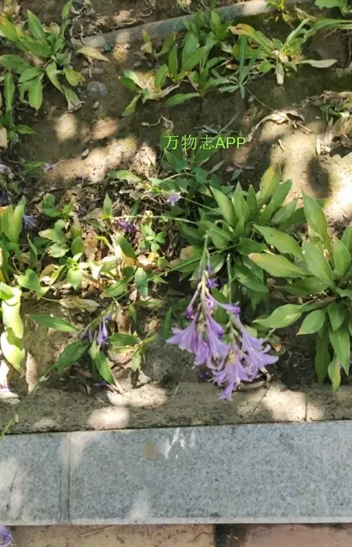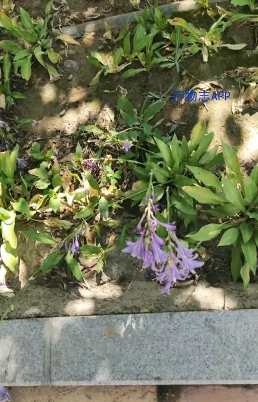 根状茎粗约1厘米,有长的走茎。叶矩圆状披针形、狭椭圆形至卵状椭圆形,长10-15厘米,宽2-6(-7)厘米,先端近渐尖,基部楔形或钝,具5-8对侧脉;叶柄长5-26厘米,由于叶片下延而至少上部具狭翅,翅每侧宽2-5毫米。花葶高33-55厘米,具几朵至二十几朵花;苞片近宽披针形,长5-7毫米,膜质;花单生,长4-4.5厘米,盛开时从花被管向上逐渐扩大,紫色;花梗长5-10毫米;雄蕊稍伸出花被之外,完全离生。花期8月。