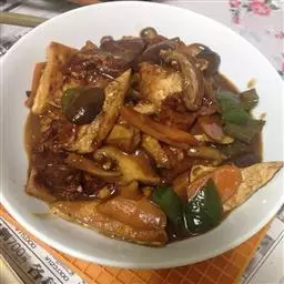 山珍豆腐是一道川菜,主料有豆腐,调料有大葱、姜、植物油、酱油、料酒。