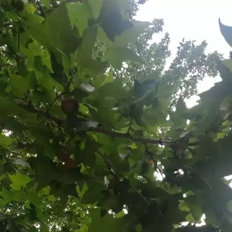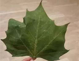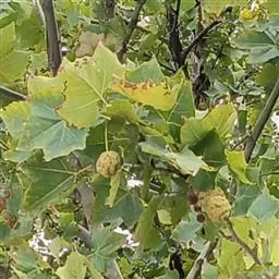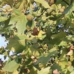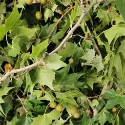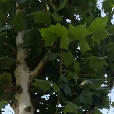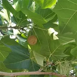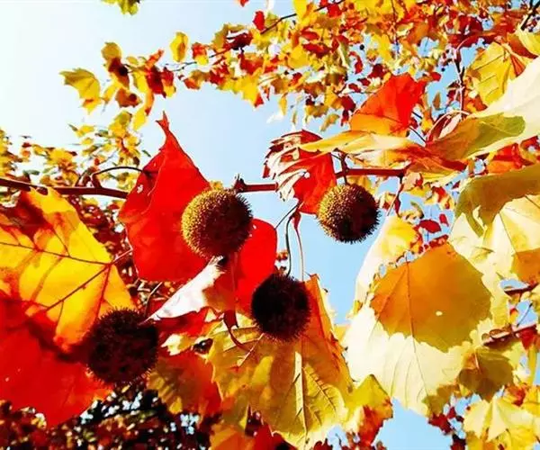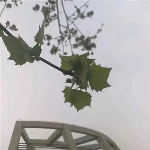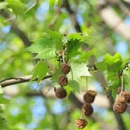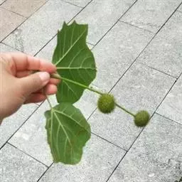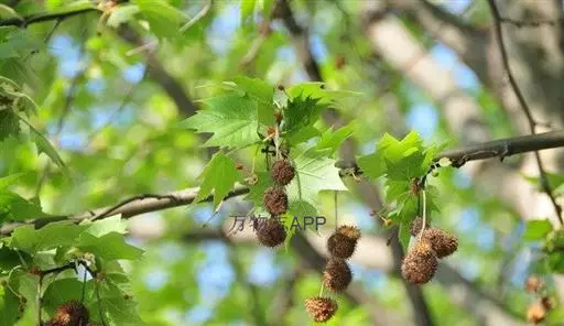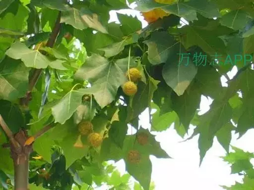 其树冠阔钟形;干皮灰褐色至灰白色,呈薄片状剥落。幼枝、幼叶密生褐色星状毛。叶掌状5-7裂,深裂达中部,裂片长大于宽,叶基阔楔形或截形,叶缘有齿牙,掌状脉;托叶圆领状。花序头状,黄绿色。多数坚果聚全叶球形,3-6球成一串,宿存花柱长,呈刺毛状,果柄长而下垂。