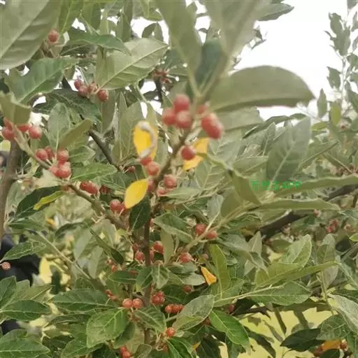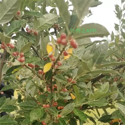 牛奶子,别名:剪子果、甜枣、麦粒子,拉丁文名:Elaeagnus umbellate Thunb.属于胡颓子科、胡颓子属落叶直立灌木,小枝甚开展,多分枝,幼枝密被银白色和少数黄褐色鳞片,有时全被深褐色或锈色鳞片,老枝鳞片脱落,灰黑色;芽银白色或褐色至锈色。叶纸质或膜质,椭圆形至卵状椭圆形或倒卵状披针形,成熟后全部或部分脱落,干燥后淡绿色或黑褐色,下面密被银白色和散生少数褐色鳞片,果实几球形或卵圆形,幼时绿色,被银白色或有时全被褐色鳞片,成熟时红色;果梗直立,花期4-5月,果期7-8月。 果实、叶、根具有治泻痢、消渴、喘咳、祛风、利湿、月经过多和风湿关节等药用价值;此外,还可作为提取香精、工业用油、人造纤维板、植物源农药等的原材料。