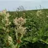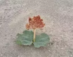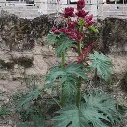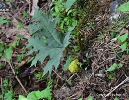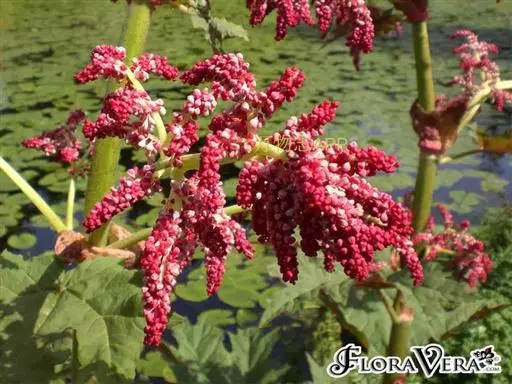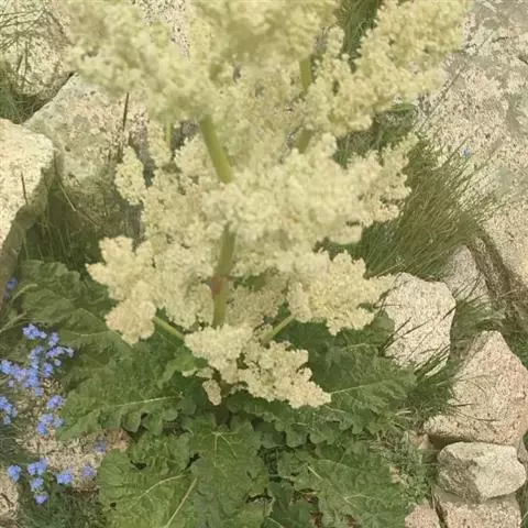 掌叶大黄(Rheum palmatum L.)蓼科,大黄属高大粗壮草本植物,高可达2米,粗壮木质根状茎。茎直立中空,叶片长宽近相等,基部近心形,叶上面粗糙到具乳突状毛,叶柄粗壮,圆柱状,与叶片近等长,托叶鞘大,内光滑,外粗糙。圆锥花序,花小, 通常紫红色,有时黄白色;花梗关节位于中部以下;花被片外轮较窄,内轮较大,宽椭圆形到近圆形,雄蕊不外露,与花丝基部粘连;子房菱状宽卵形,果实矩圆状椭圆形到矩圆形,种子宽卵形,棕黑色。6月开花,8月结果。