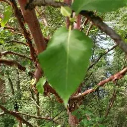 叶厚纸质,三角状卵形,三角状菱形,三角形,少有菱状卵形和宽卵形,长3-9厘米,宽2- 7.5厘米,顶端锐尖、渐尖至尾状渐尖,基部截形,宽楔形或楔形,有时微心形或近圆形,边缘具重锯齿,有时具缺刻状重锯齿或单齿,上面于幼时疏被毛和腺点,成熟后无毛无腺点, 下面无毛,密生腺点,侧脉5-7(-8)对;叶柄细瘦,长1-2.5厘米,无毛。