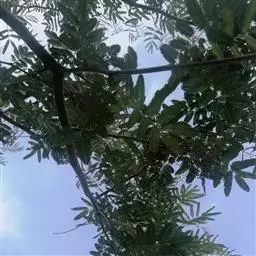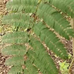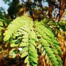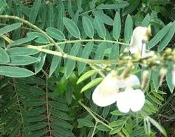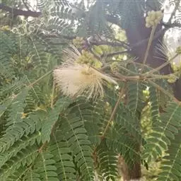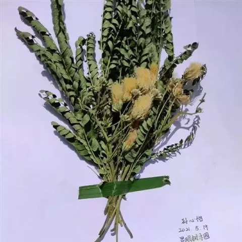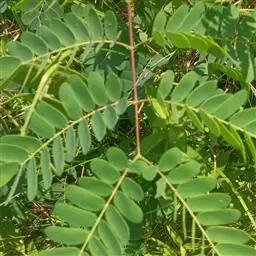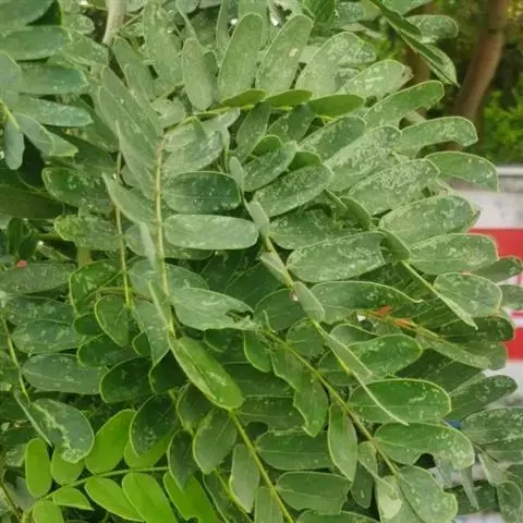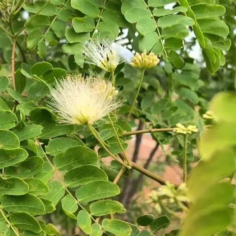 托叶线状披针形,较小叶小,早落;二回羽状复叶,互生;总叶柄长3-5cm,总花柄近基部及最顶1对羽片着生处各有一枚腺体;羽片4-12对,栽培的有时达20对;小叶10-30对,线形至长圆形,长6-12mm,宽1-4mm,向上偏斜,先端有小尖头,有缘毛,有时在下面或仅中脉上有短柔毛;中脉紧靠上边缘。