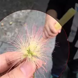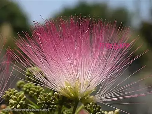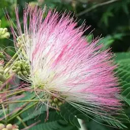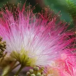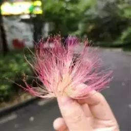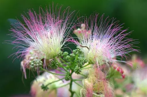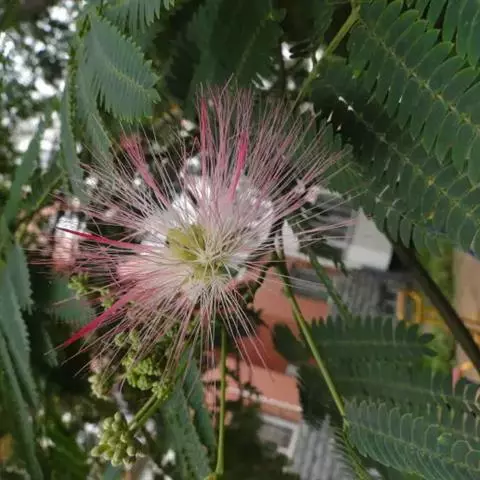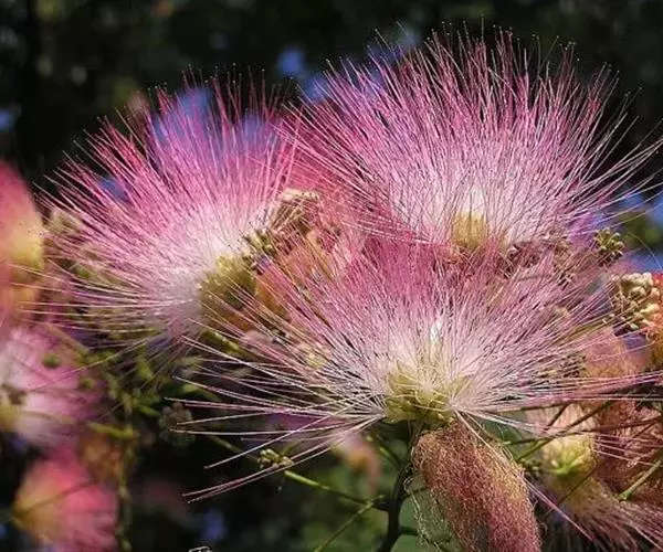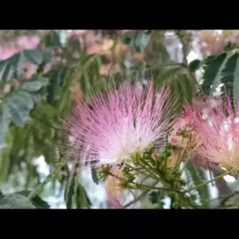 合欢(Albizia julibrissin Durazz.), 又名绒花树,马缨花。落叶乔木,夏季开花,头状花序,合瓣花冠,雄蕊多条,淡红色。荚果条形,扁平,不裂。高4-15米。树冠开展;小枝有棱角,嫩枝、花序和叶轴被绒毛或短柔毛。托叶线状披针形;头状花序于枝顶排成圆锥花序;花粉红色;花萼管状,花期6-7月;果期8-10月。