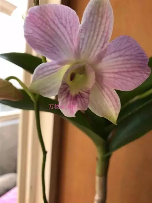 偏向石斛(D.secundum),花淡紫红色,唇瓣橙黄色。