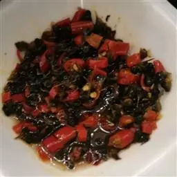 蕨根粉100g,辣椒油一大勺,醋两小勺,生抽一小勺,盐1g,青红尖椒各两个,大蒜四瓣。