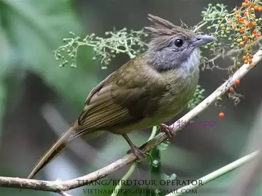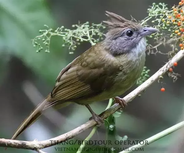 白喉冠鹎(学名:Alophoixus pallidus):体长20-25厘米。头顶红褐色,有长而细的羽冠、红褐色,头侧灰色。上体橄榄绿黄色,飞羽暗褐色,外翈茶黄色,尾下覆羽皮黄色。