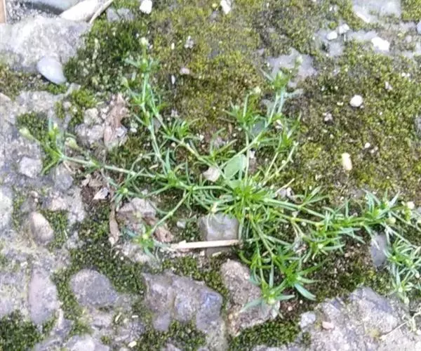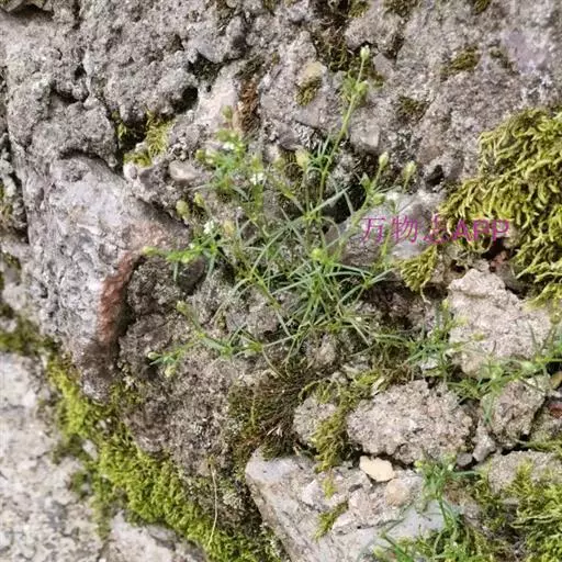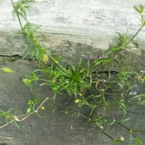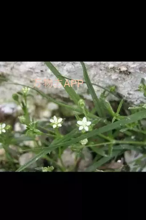 漆姑草:一年生小草本,高10-15cm。茎纤细,由基部分枝,丛生,下部平卧,上部直立,无毛或上部稍被腺毛。单叶对生;叶片线形,长5-20mm,宽约1mm,具1条脉,基部抱茎,合生成膜质的短鞘状,先端渐尖,无毛。花小形,通常单一,腋生于茎顶;花梗细小,直立,长约1-2.5cm,疏生腺毛;萼片5,长圆形乃至椭圆形,长1.5-2mm,先端钝圆,稍微呈兜状依附于成熟的蒴果,背面疏生腺毛乃至无毛,具3条脉,边缘及先端为白膜质;花瓣5,白色卵形,先端圆,长约为萼片的2/3左右;雄蕊5;子房卵圆形,花柱5。蒴果广椭圆状卵球形,比宿存萼片稍长或长出1/3左右;通常5瓣裂,裂瓣椭圆状卵形,先端钝。种子微小,褐色,圆肾形,长0.4-0.5mm,两侧稍扁,背部圆,密生瘤状突起。花期5-6月,果期6-8月。