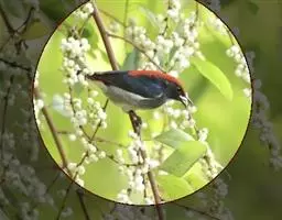 叉尾太阳鸟,雀形目太阳鸟科太阳鸟属留鸟;为小型鸟类,雄鸟头顶辉蓝绿色,上体橄榄绿色,腰明黄色,…