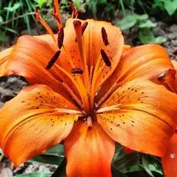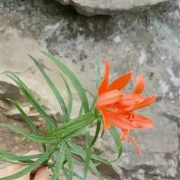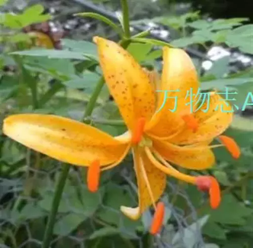 花单生或2~7朵排列成总状花序;苞片叶状,披针形,长4.5~5.5cm,宽0.8~1.5cm;花梗长2~8.5cm;花橙黄色或橙红色,有紫红色斑点;花被片长椭圆形,长4.8~5.2cm,宽1.2~1.4cm,蜜腺两边无乳头状突起;花丝长3cm,无毛,花药橙黄色;子房圆柱形,长8~12mm,宽3~4mm;花柱长为子房的2倍,柱头膨大,常3裂。