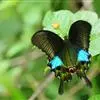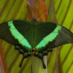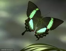 巴黎翠凤蝶中型凤蝶,躯体黑褐色,散布绿色亮鳞。后翅M3脉端有一明显叶状尾突。翅背面底色黑褐色,密布…
