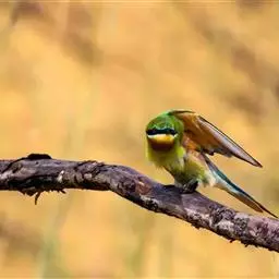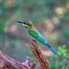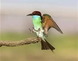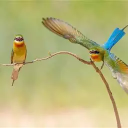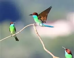 蓝颊蜂虎:是蜂虎科、蜂虎属的鸟类,共有2个亚种。体长27-33厘米,翼展46-49厘米,…