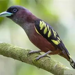 长尾阔嘴鸟是雀形目阔嘴鸟科的鸟类,体长约25厘米,是绿色阔嘴鸟。形长的楔形尾蓝色,喉及脸黄色,顶冠…