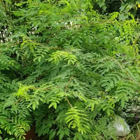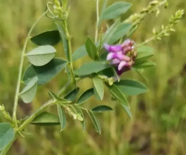 托叶半箭头形,长0.8-2厘米,边缘有3-4裂齿;小叶4-7对,互生或近对生,椭圆形至卵披针形,长1.3-4厘米,宽0.5-1.8厘米;先端圆,微凹,基部近圆形,上面被贴伏长柔毛,下面粉白色;沿中脉毛被较密,侧脉扇状展开直达叶缘。