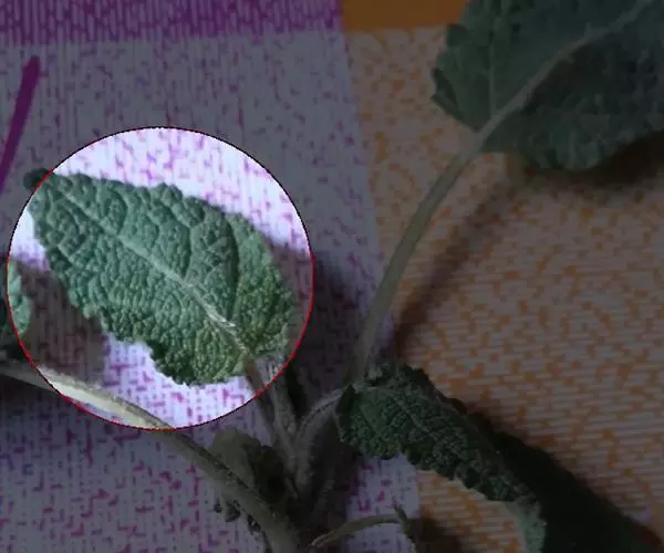 叶椭圆状卵圆形或椭圆状披针形,长2-6厘米,宽0.8-2.5厘米,先端钝或急尖,基部圆形或楔形,边缘具圆齿、牙齿或尖锯齿,草质,上面被稀疏的微硬毛,下面被短疏柔毛,余部散布黄褐色腺点;叶柄长4-15毫米,腹凹背凸,密被疏柔毛。