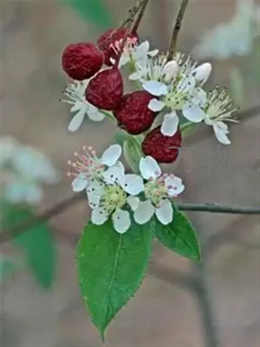 核果扁球形或球形,直径12-15毫米,鲜红色,果肉浅黄色,味酸,粘核;核球形,褐色,直径7-8毫米。花期4-5月,果期6-7月。2n=32。
