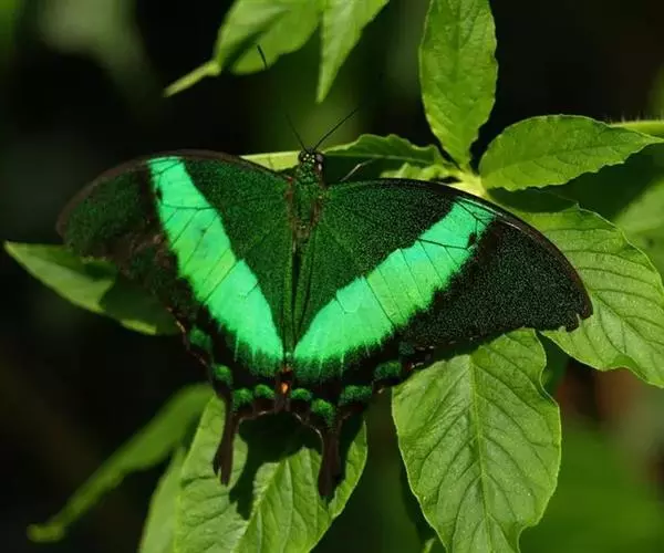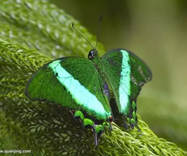 形态 成虫:翅展90—135 mm。体、翅黑色,满布翠绿色鳞片,在脉纹间更集中,已表现出翠绿带。雄蝶前翅在cu2—m3室有天鹅绒状的性标。后翅翠绿色鳞片有的均匀地散布,有的集中在基半部,有的集中在上角附近呈翠蓝色,有的集中在中后区的上半部。亚外缘有1列弯月形蓝色斑纹和红色斑纹;外缘波状;臀角有红色环形斑纹。翅反面前翅亚外缘区有灰黄或灰白色宽带,由后缘向前缘放射,越接近前缘越宽,颜色、越淡。后翅亚外缘区红色月牙形或钩形斑纹十分明显。其余与正面相似。