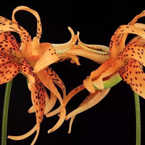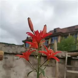 鳞茎白色,高4~7厘米,直径5~8厘来,宽卵形,深入土中约10厘米;茎直立,坚硬,基部埋在土内的部分具2~3轮纤维状根,地上部分高1.2~1.5米,直径 0.8~1.2厘米,有棱纹,深紫色,而被白色绵毛。叶散生,无柄,光亮,披针形,长3~15厘米,宽0.5~1.5厘米,先端渐尖,具显著叶脉5条以上,上部叶片逐渐变短以至形成叶状苞片,通常叶腋间生有珠芽;珠芽球形,直径2~3毫米,老时变为黑色。花序总状圆锥形;花梗粗硬,开展,花朵稍下垂;花被片6,桔红色,密生紫黑色斑点,开放时反卷,披针形,长8厘米,宽1.5厘米;雄蕊长5~7厘米,花药紫色,且具斑点;柱头紫色,子房长1.3~1.8厘米。果实倒卵形,长3~4厘米。花期一般在7月。