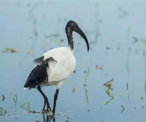 圣鹮头、颈黑色,身体白色,初级和次级飞羽尖端黑色。喙长且厚、黑色下弯,跗蹠与趾黑色。…