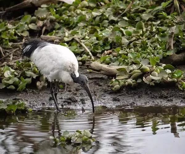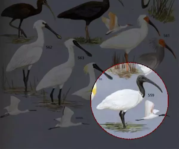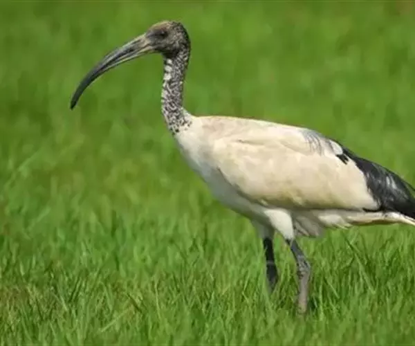 圣鹮(学名:Threskiornis aethiopicus)头、颈黑色,身体白色,初级和次级飞羽尖端黑色。喙长且厚、黑色下弯,跗蹠与趾黑色。下背部有大量黑色纱状装饰羽,翼下裸露皮肤红色,体侧有时带黄褐色。亚成鸟的头、颈有羽毛,斑驳黑色带有白色纵纹,三级飞羽棕黑色。