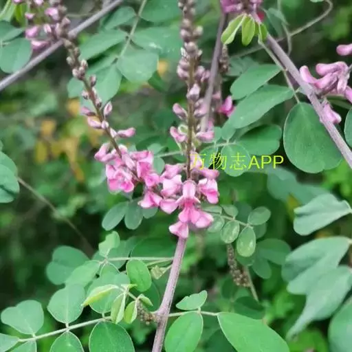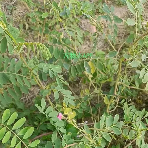 小灌木,高50-80cm,罕更高。茎直立,小枝被银白色丁字毛。叶互生;叶柄长1.3-2.5cm;托叶小,锥形;奇数羽状复叶,长2.5-5cm,小叶对生,小叶9-13片,叶片卵状长圆形或倒卵状椭圆形,长1.5-3cm,宽0.5-1.5cm,先端钝圆,有小尖,基部楔形,全缘,两面被丁字毛,叶干时常带蓝色。总状花序长2.5-5cm,通常腋生,远较叶为短,花疏生,有花约20朵;萼钟形,斜形,被银白色丁字毛,5齿裂;花冠蝶形,红黄色,长约4mm,旗瓣宽卵形至长圆形,外面有毛,翼瓣卵圆形,微与龙骨瓣相连,龙骨瓣匙形,爪上有距;雄蕊10,二体;子房无柄,花柱短,内弯,柱头头状。荚果线状圆柱形,直或稍弯,长约2.5-3cm,种子间有缢缩,外形似串珠,有毛或无毛。有种子5-10颗。种子长圆形,长约1.5mm。花期5-10月,果期6-11月。