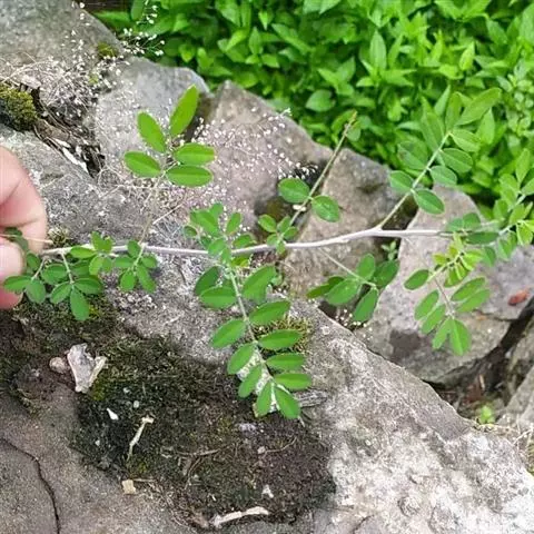 药材性状:枝条圆柱形,有纵棱,被白色丁字毛。羽状复叶互生,小叶9-13,常脱落,小叶倒卵状矩圆形或倒卵形,长1-2cm,宽0.5-1.5cm,先端钝,有短尖,基部近圆形,两面被丁字毛,叶柄、叶轴与小叶柄均被白色丁字毛。气微,味微苦。