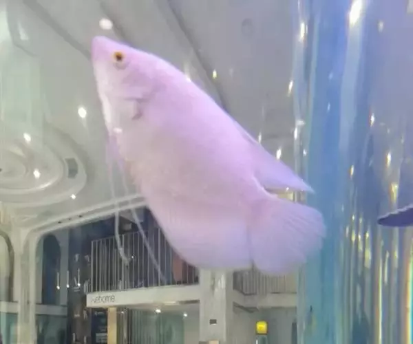 招财鱼,Osphronemus goramy (Lacepède, 1801),又名战船、长丝鲈,原产地越南、泰国、马来西亚等,是鲈形目(Perciformes)攀鲈亚目(Anabantoidei)丝足鲈科 (Osphronemidae)丝足鲈属的一种鱼类。该科的鱼一般体型都比较小,但招财是该科鱼中的巨人。成鱼体长20~69厘米,椭圆形。体色灰褐,腹鳍变异为两根长长的丝鳍,各鳍浅红色。饲养水温22~32摄氏度,水质要求不严,易饲养。繁殖水温26~27摄氏度雄鱼背鳍末梢尖长,属泡沫卵生鱼类。在水族箱水面上漂浮几颗水草,将一对亲鱼放入,雄鱼在水面上突出大量泡沫,并将受精卵突入泡沫中孵化。雌鱼每次产卵500~1000粒。具有很强的领域性,会攻击其他鱼类,不推荐与其他鱼类混养。