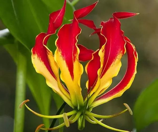 嘉兰 攀援植物;根状茎块状、肉质,常分叉,粗约1厘米。茎长2-3米或更长。叶通常互生,有时兼有对生的,披针形,长7-13厘米,先端尾状并延伸成很长的卷须(最下部的叶例外),基部有短柄。花美丽,单生于上部叶腋或叶腋附近,有时在枝的末端近伞房状排列;花梗长可达10-15厘米;花被片条状披针形,长4.5-5厘米,宽约8毫米,反折,由于花俯垂而向上举,基部收狭而多少呈柄状,边缘皱波状,上半部亮红色,下半部黄色,宿存;花丝长3-4厘米,花药条形,长约1厘米;花柱丝状,与花丝近等长,分裂部分长约6-7毫米。 [1-2]