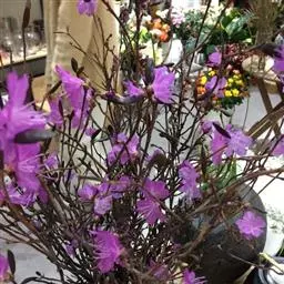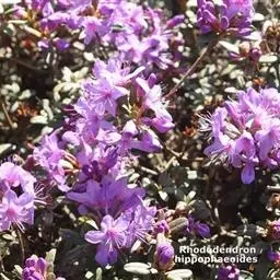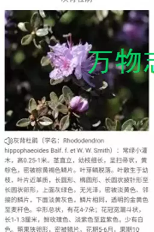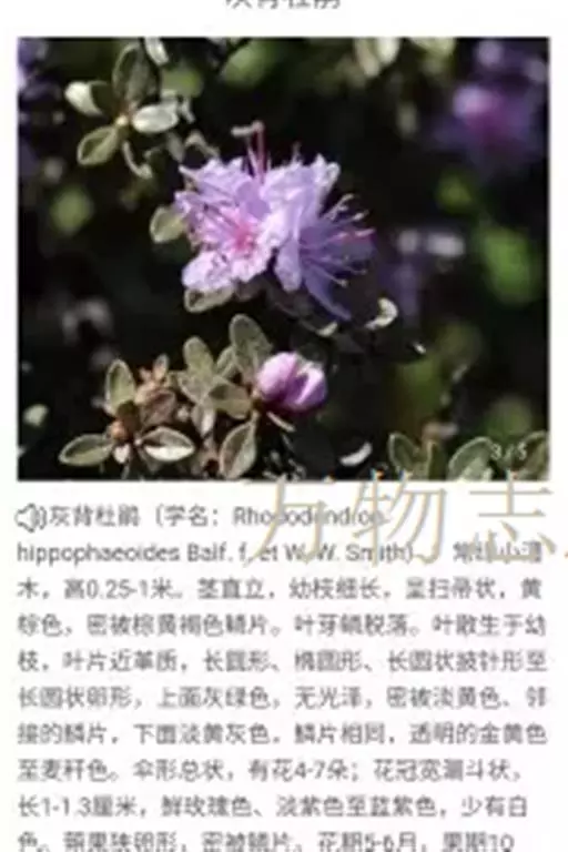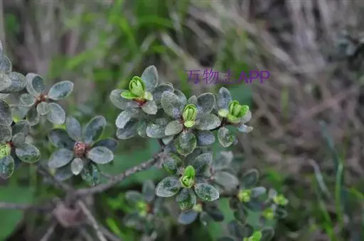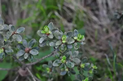 头花杜鹃(学名:Rhododendron capitatum Maxim.):常绿小灌木,高0.5-1.5米,分枝多,枝条直立而稠密。幼枝短,黑色或褐色。叶近革质,芳香,椭圆形或长圆状椭圆形,上面灰绿或暗绿色,下面淡褐色。花序顶生,伞形,有花2-5朵;花冠宽漏斗状,长13-15毫米,淡紫或深紫,紫蓝色。蒴果卵圆形。花期4-6月,果期7-9月。