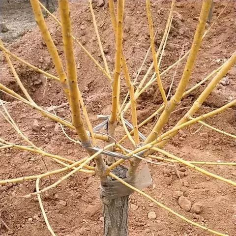嫁接后一个月,成活的接穗即可发芽。同时砧木上的隐芽也会萌发,形成萌蘖,要及时将其去除,以免影响接穗生长。因接穗生长旺盛,要及时解绑,并将新梢绑缚在木棍上,以防其被风刮坏。