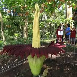 花序柄长50-70厘米,粗1.5-2厘米,色泽同叶柄。佛焰苞漏斗形,长20-30厘米,基部席卷,管部长6-8厘米,宽3-4厘米,苍绿色,杂以暗绿色斑块,边缘紫红色;檐部长15-20厘米,宽约15厘米,心状圆形,锐尖,边缘折波状,外面变绿色,内面深紫色。肉穗花序比佛焰苞长1倍,雌花序圆柱形,长约6厘米,粗3厘米,紫色;雄花序紧接(有时杂以少数两性花),长8厘米,粗2-2.3厘米;附属器伸长的圆锥形,长20-25厘米,中空,明显具小薄片或具棱状长圆形的不育花遗垫,深紫色。花丝长1毫米,宽2毫米,花药长2毫米。子房长约2毫米,苍绿色或紫红色,2室,胚珠极短,无柄,花柱与子房近等长,柱头边缘3裂。浆果球形或扁球形,成熟时黄绿色。花期4-6月,果8-9月成熟。