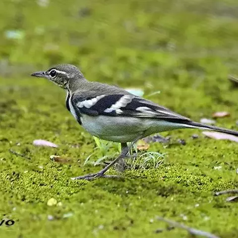 日本鹡鸰:体长约20厘米。上体多黑色,额、颏及眉纹白,下体白,两翼黑而具白色横斑及羽缘,…