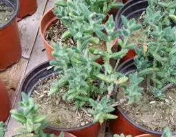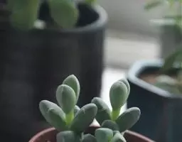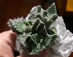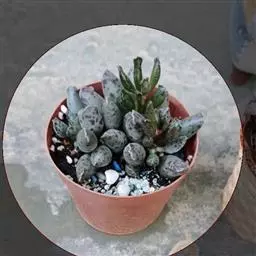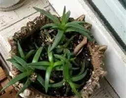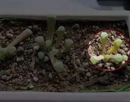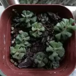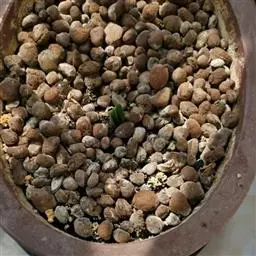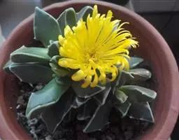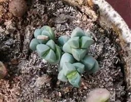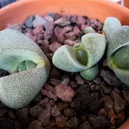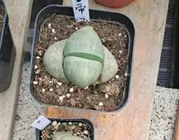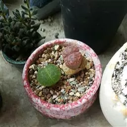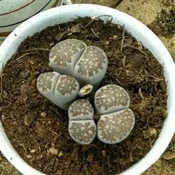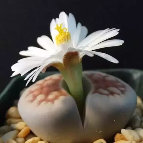 荒玉为番杏科生石花属,原产南非。株体呈白粉色,表面布满凹凸纹路,凹陷处为红褐色,每年秋季开黄花。