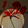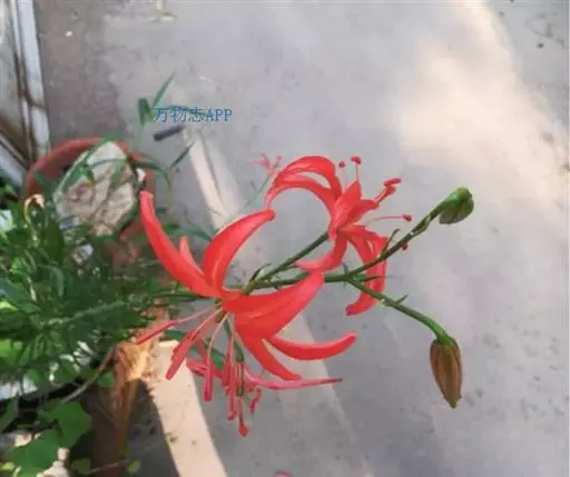 山丹百合 鳞茎卵形或圆锥形,高2.5-4.5厘米,直径2-3厘米;鳞片矩圆形或长卵形,长2-3.5厘米, 宽1-1.5厘米,白色。茎高15-60厘米,有小乳头状突起,有的带紫色条纹。叶散生于茎中部,条形,长3.5-9厘米,宽1.5-3毫米,中脉下面突出,边缘有乳头状突起。花单生或数朵排成总状花序,鲜红色,通常无斑点,有时有少数. 斑点,下垂;花被片反卷,长4-4.5厘米,宽0.8-1.1厘米,蜜腺两边有乳头状突起;花丝长1.2-2.5厘米,无毛,花药长椭圆形,长约1厘米,黄色,花粉近红色;子房圆柱形,长0.8-1厘米;花柱稍长于子房或长1倍多,长1.2-1.6厘米,柱头膨大,径5毫米,3裂。蒴果矩圆形,长2厘米,宽1.2-1.8厘米。花期7-8月,果期9-10月。