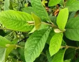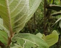 叶卵状披针形或菱伏披针形,有时卵形,长1.2-3.5厘米,宽0.5-1.8厘米,先端渐尖或急尖,基部渐狭,边缘具锐尖的疏齿,近基部全缘,纸质,上面榄绿色,无毛或近无毛,下面灰白色,无毛,散布凹陷腺点;叶柄长3-18毫米,腹凹背凸,腹面被微柔毛。
