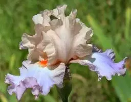 花茎实心,光滑,高40-60厘米,有不明显的纵棱,中、下部有2-3枚茎生叶;苞片3-5枚,膜质,披针形,长6-9厘米,宽1-1.5厘米,顶端渐尖或短渐尖,中脉明显,内包含有2-4朵花;花大,蓝紫色,直径9-10厘米;花梗长1.5-3.5厘米;花被管上部稍膨大,似喇叭形,长约2厘米,直径5-7毫米;外花被裂片倒卵形或椭圆形,长7.5-9厘米,宽4-4.5厘米,上部反折下垂,爪部楔形,中央下陷呈沟状,鲜黄色,无附属物,内花被裂片直立,倒披针形,长5-6.5厘米,宽4.8-1.5厘米;雄蕊长约3厘米,花药白色;花柱分枝扁平,花瓣状,拱形弯曲,长5-6厘米,宽约1.2厘米,顶端裂片半圆形,长1.5-2厘米,边缘有波状的牙齿,子房钝三角状圆柱形,上部略膨大,长2-2.2厘米,直径约6毫米。